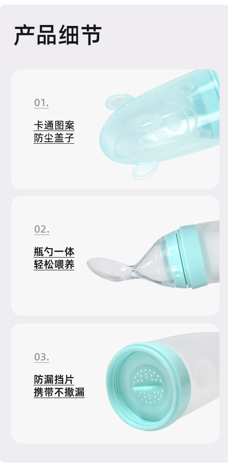 多功能性:除了作為勺子使用外,本產品還配備有可拆卸的瓶身部分,可作為小容量奶瓶或水杯使用,實現一物多用,方便實用。