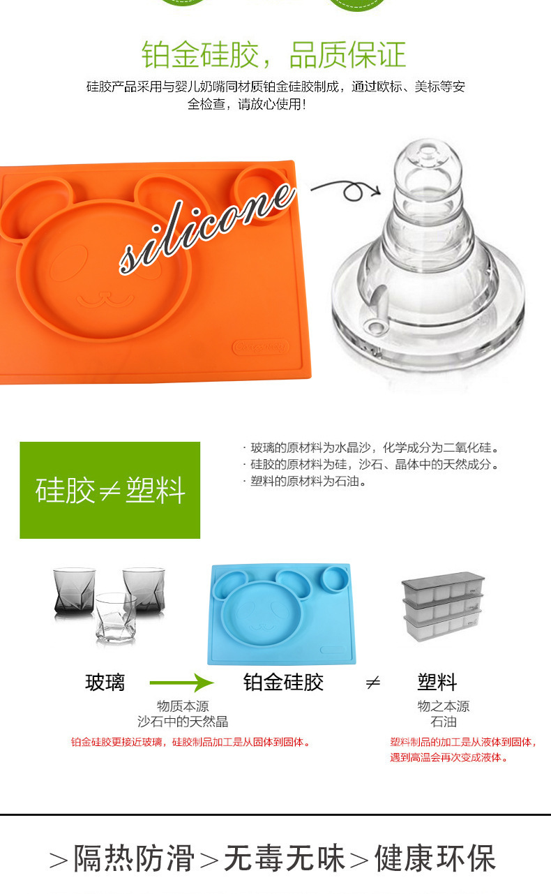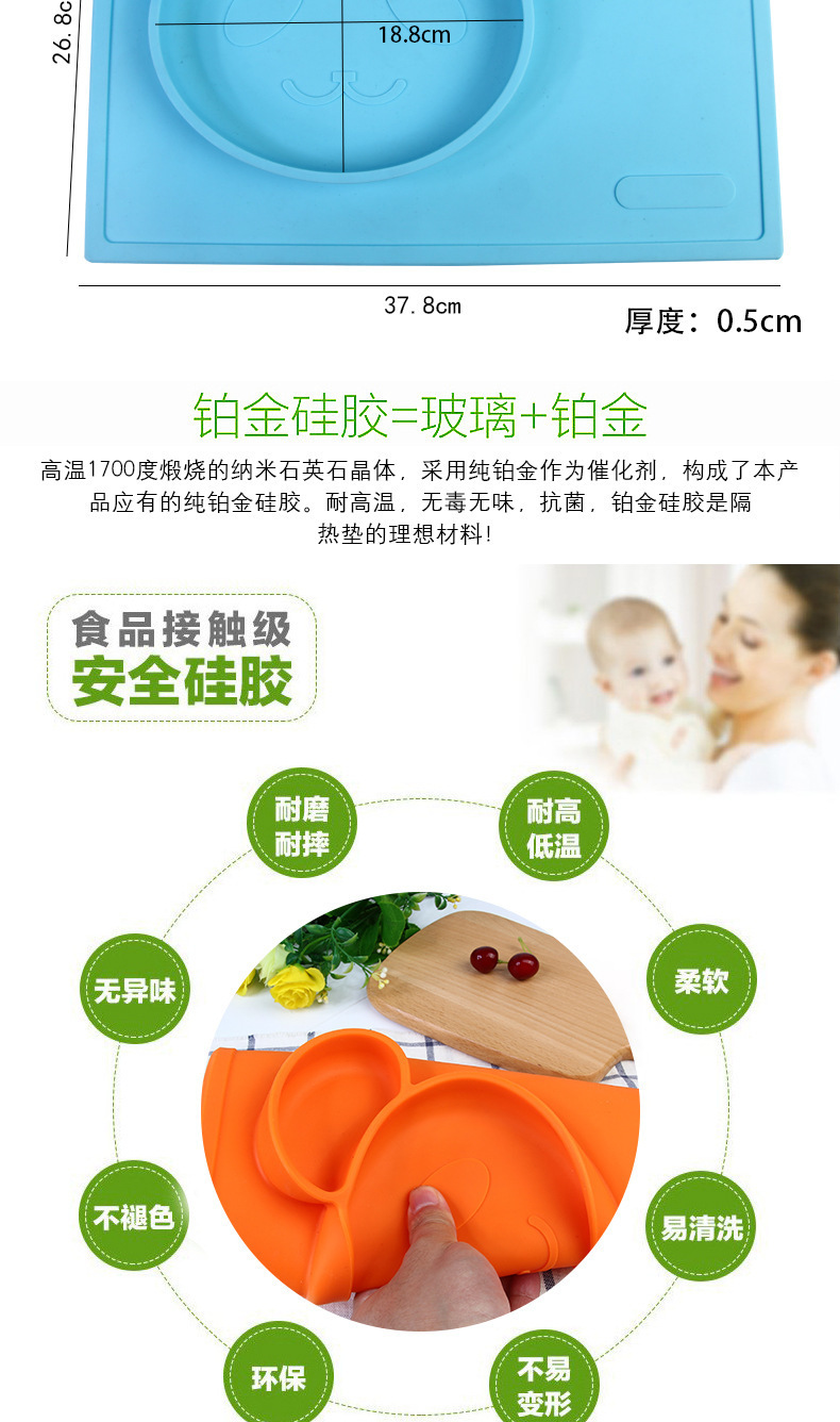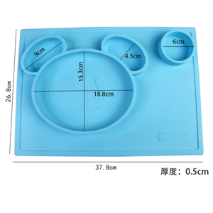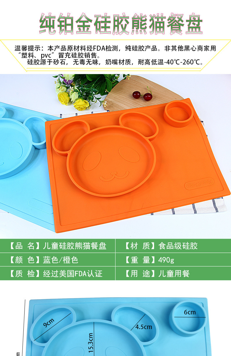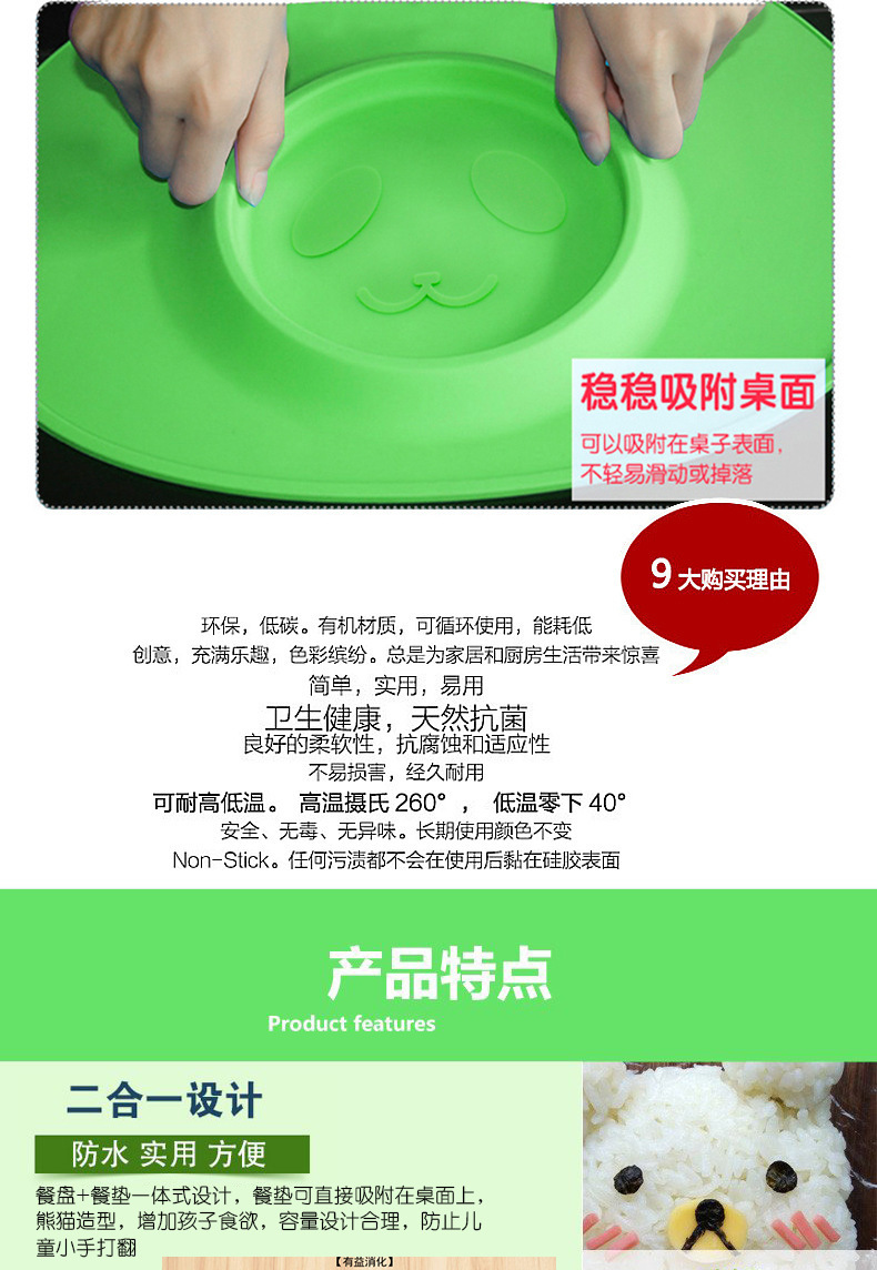 特點:二合一設計,防水、實用、方便,餐盤+餐墊一體式設計,餐墊可直接吸附在桌麵上,熊貓造型,增加孩子的食欲,容量設計合理,防止兒童小手打翻。