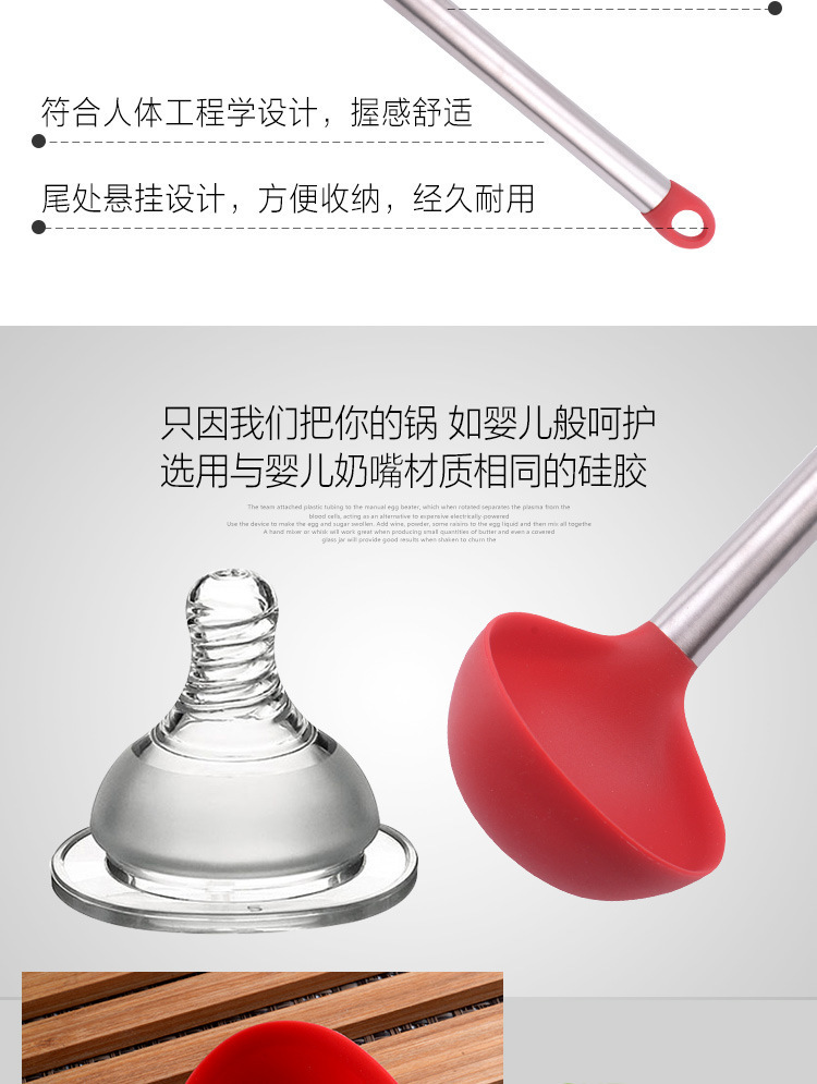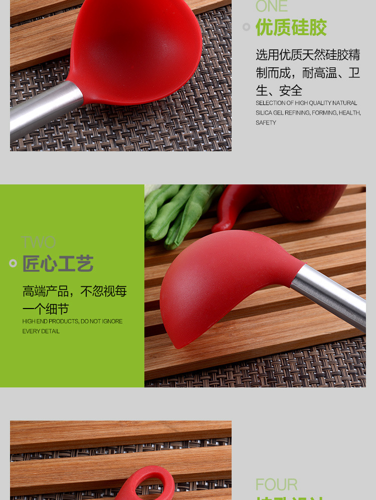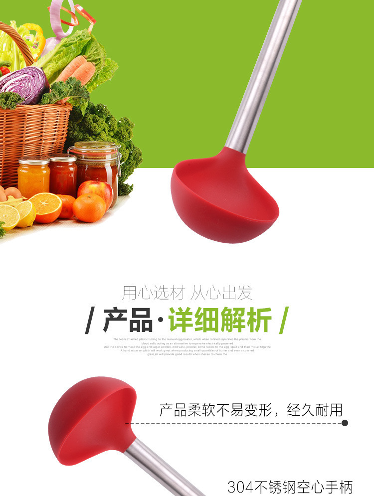 1、這件矽膠廚具完美的適用於家庭廚房,安全環保耐用,很好的保護了不粘鍋的塗層,減少摩擦,也打破廚房用品顏色單一選擇,讓廚房時光更加美好
